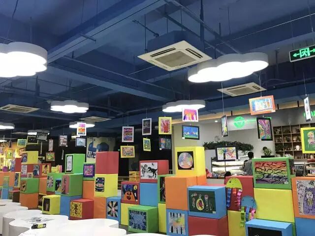 (童艺童彩馆由许多五颜六色的箱子拼装而成,而孩子们的大作就在这些彩色箱子间穿插展现,梦幻感十足。)